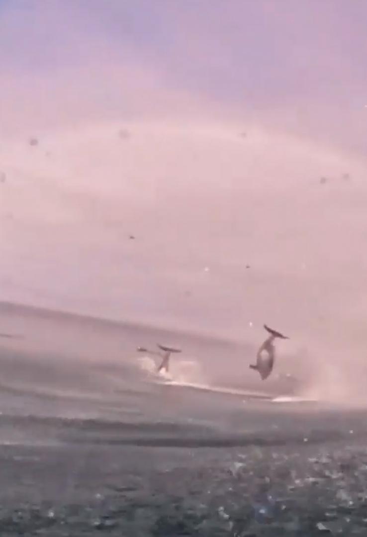 Orca whales have been decimating the dolphin population. This appears to me that the ocras are chasing those dolphins.