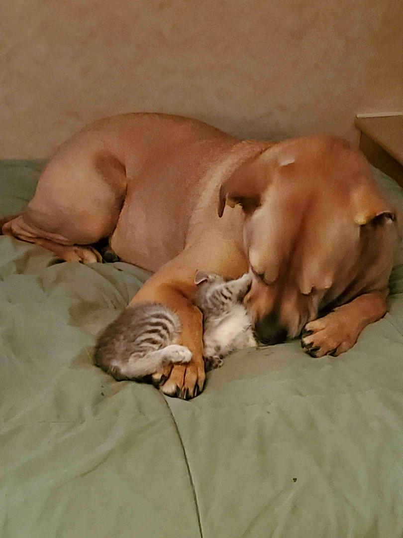 These two are best friends. Carly Jo my pitt/boxer mix and Hazel, our tiny grew kitty. One meow out of Hazel and Carly Jo comes running quickly.
