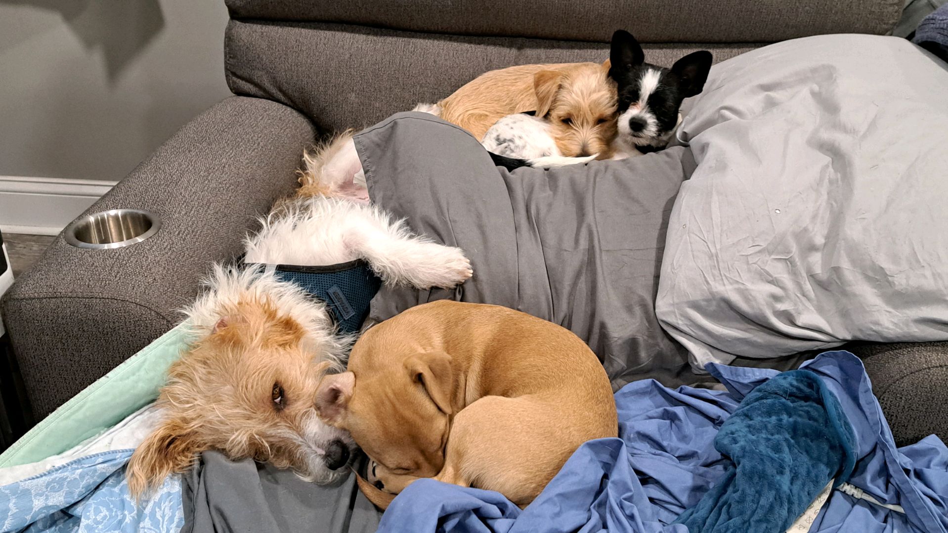 The fur babies must have had a rip-roaring time at this daycare! They are all pooped out and just need a good nap. Others are showing their love to the handlers through some shared quiet time and kisses.