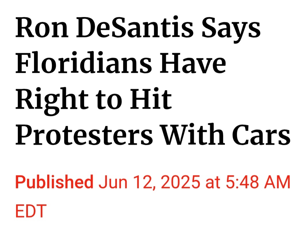 Someone needs to tell white boots Desatsn that if a protesters are attempted to be run down because of what he said, one of two things would have a good chance of happening: 1) DeSatan would be brought up on charges of accomplice to attempted murder. or 2) His maga buddy, trying to run down innocent people might get shot and be leaving the scene in a body bag. Speaking as a Floridian who has lived here for decades before trump's magas came into power, most, if not of all of the protesters stay on the sidewalk.