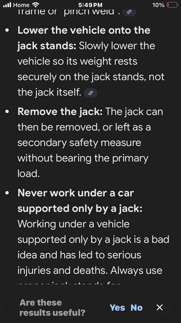 From Google: To use jack stands correctly, park on a level surface, chock the wheels, lift the vehicle with a jack at designated points (using owner's manual), place sturdy stands under the frame or pinch welds (never just the jack), slowly lower the car onto the stands, and always perform a "shake test" to confirm stability before working underneath, keeping the jack in place for extra security if possible.