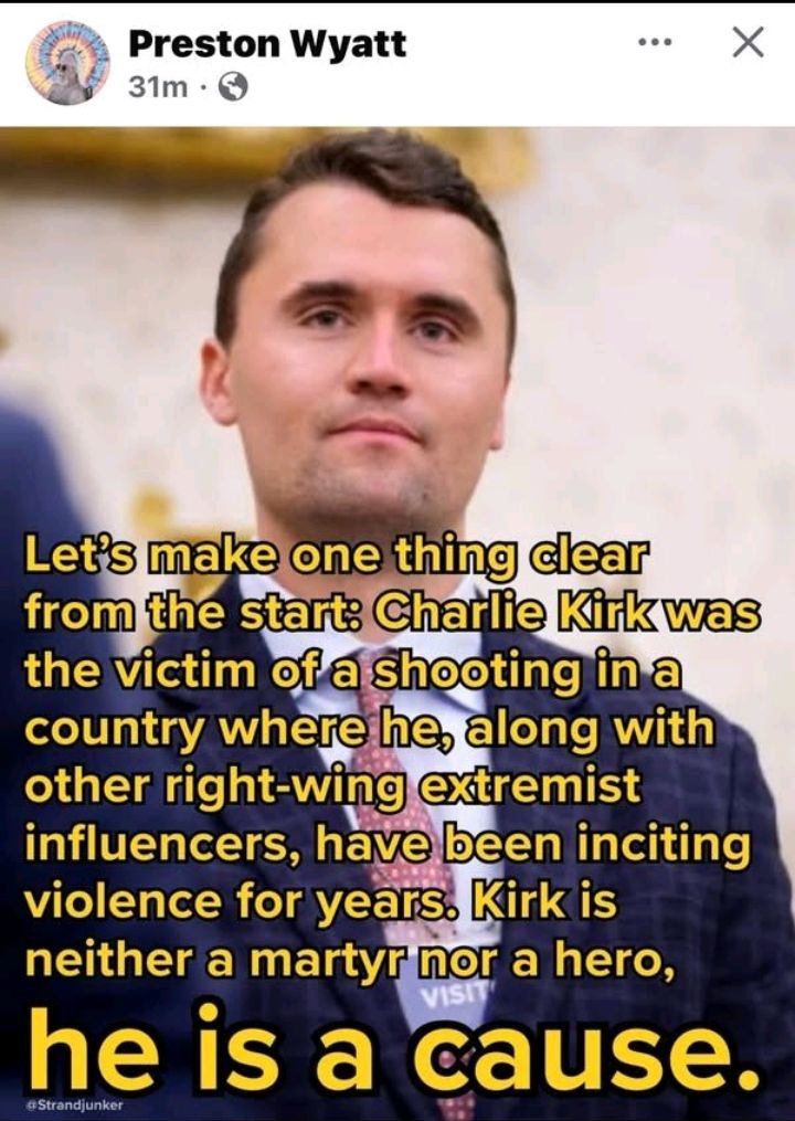 all right people I got the balls to say and I'm an old lady and I don't care who reads this. it is not disrespectful to tell the truth even after a person dies. Charlie Kirk was not a preacher he was not a politician he was no more than a College Dropout social media influencer. he was successful at his influence in job but that's all he was. he preached in his speeches he talked about how much he hated blacks especially black females he talked about his hatred he talked about his love of guns his love of gun freedom and even said there would be collateral damage. how ironic did he himself died from the gun violence that he advocated as acceptable and part of our second amendment. he preached hatred every time you opened his mouth. no it is not good that he was murdered. the only good thing that has come out of his death is a good example of what not to be and a teaching moment for our children. you live by the rules of hatred and bigotry you'll die by the same rules.
