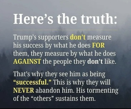this man is a hateful evil thing. Can't even call him human. he's not a happy thing even with all that money he's taken and grifted. he's slowly dying. what's keeping him alive is all that hatred he has inside. he thrives on that and he wants to hurt and get even with as many people he thinks that's done him wrong before he eventually expires. he won't take a thing with him but leave behind his name with a big stain. his name will be mentioned along with the likes of Benedict Arnold, Adolf Hitler, Mussolini, Lee Harvey Oswald and others.