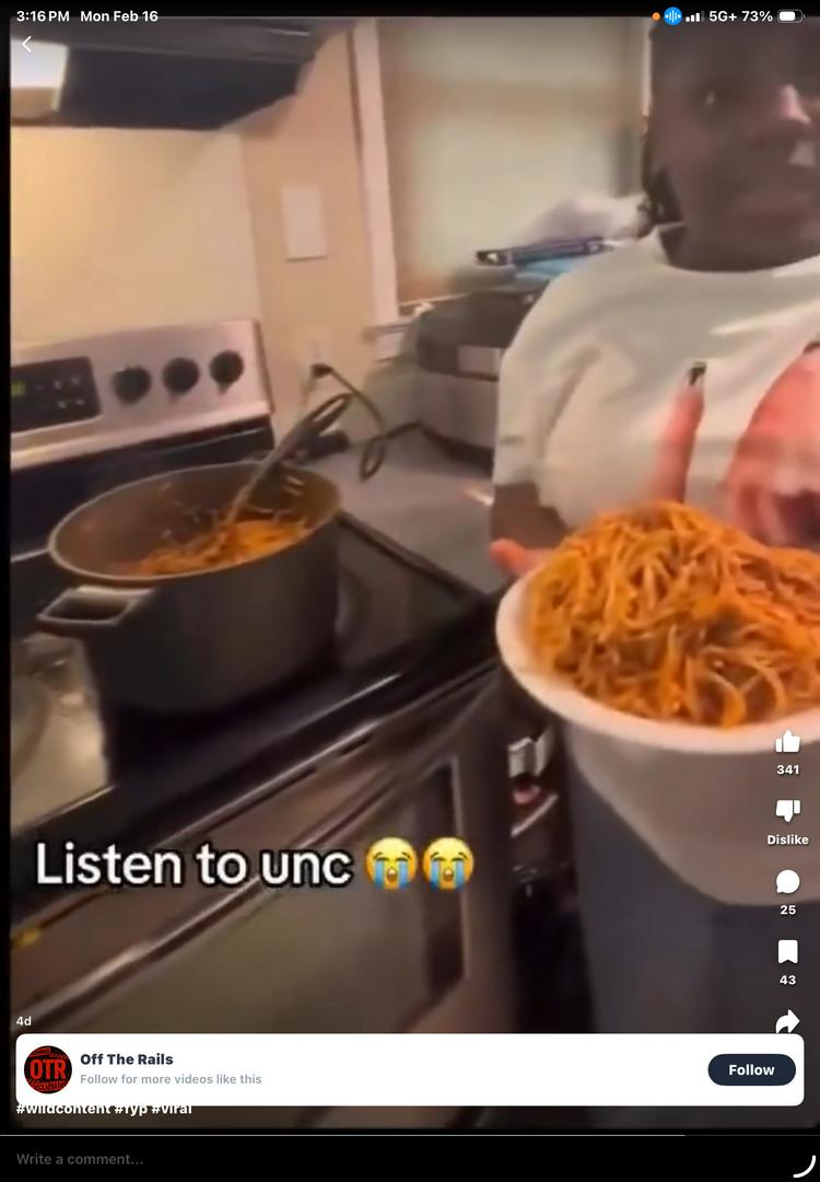No he lost his mind after the second scoop. They acting like that's a lot of spaghetti and it's not. Two scoops of spaghetti is not a lot. That's shit just makes me not even want to eat and I'm not talking about the little girl. I'm talking about her Aunt and Uncle. Now for the little girl she should of just taken 2 scoops of spaghetti not 5.