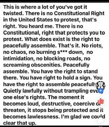 bold display of illegal assembly. we have the right to peacefully assemble not block roadways not throw stuff at people not burn cars not loot stores not a salt people
