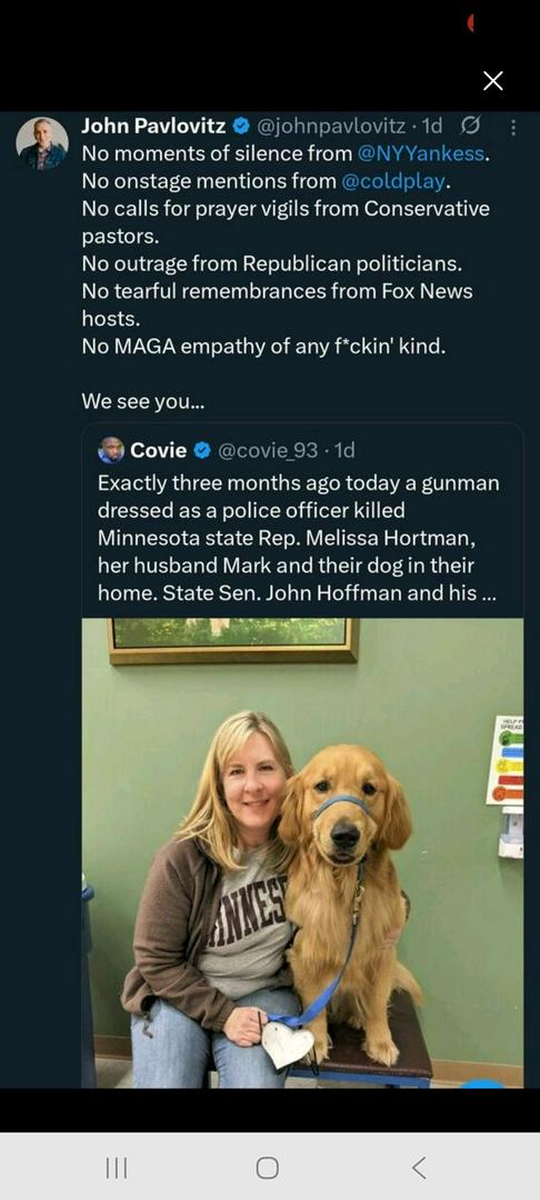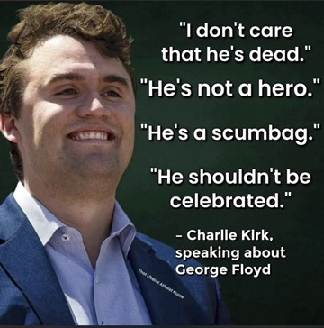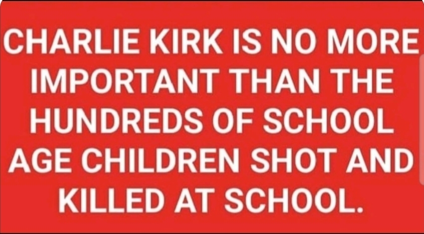 Medgar Evers was murdered in front of his wife & children: Fred Hampton was murdered in front of his wife & children: Martin Luther King was murdered on television: Malcolm X was murdered in front of his wife & children: Breonna Taylor was murdered in front of her fiance: Trayvon Martin was murdered in front of the world: Tamil Rice was murdered within 12 seconds of a police officer arriving, his mother saw that: the list is endless. Yet none of you have said word about any of that. They were all black. Did you get on your podium for them? It only matters to you because Kirk was white. I'm white and ALL LIVES matter to me.