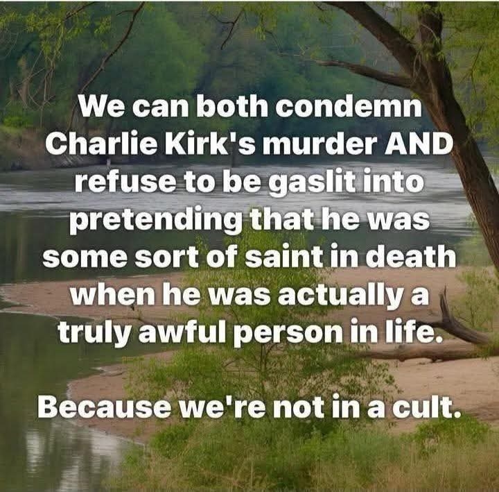 Charlie Kirk sowed hate and division wherever he went. While he didn't deserve to be murdered. He certainly doesn't deserve to be martyred!!! Every person in this building has no idea who Charlie Kirk was.he was racist, misogynist, and homophonic. Oh and by the way...his family wasn't there. They weren't even in the same state!!! 🤦♀️🤦♀️🤦♀️