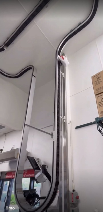 They could have ran that conveyor on the back of the counter like a circle. Would have been less money. Or could have a track to just toss it down and it stops when it hit the wall.