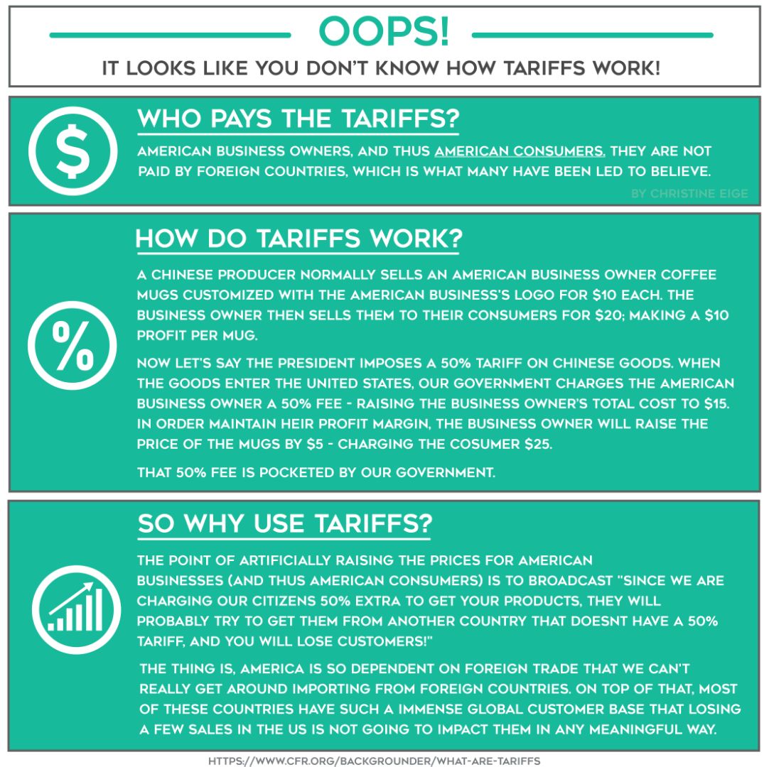Trump does not understand tariffs he seems to think that we do not pay for the tariffs when we do we are the end result they pay for his ridiculous tariffs