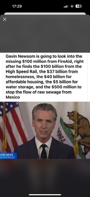 new scam every day he already caused most of the damage by not filling the reservoir so the firefighters could put out the fires or even the homeowners. His stealing their money is no surprise. He's done it all along. it's a land grab. Cali is just little Mexico anymore. newscum stole veterans money and the money for the homeless not to mention the train money.