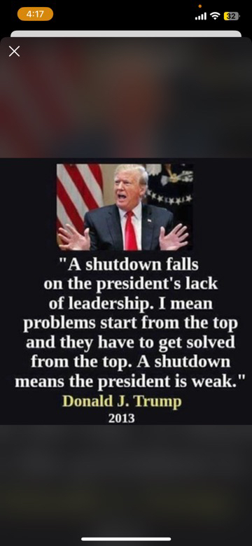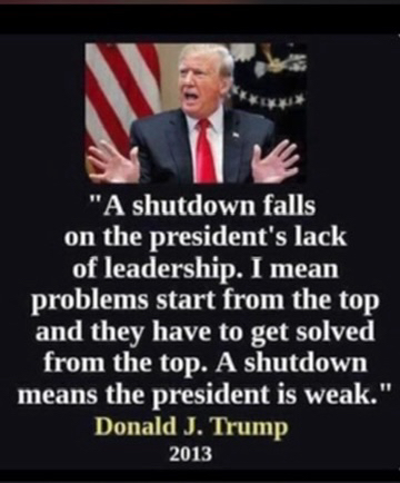 "A shutdown falls on the president's lack of leadership. I mean problems start from the top and they have to get solved from the top. A shutdown means the president is weak." Donald J. Trump 2013
