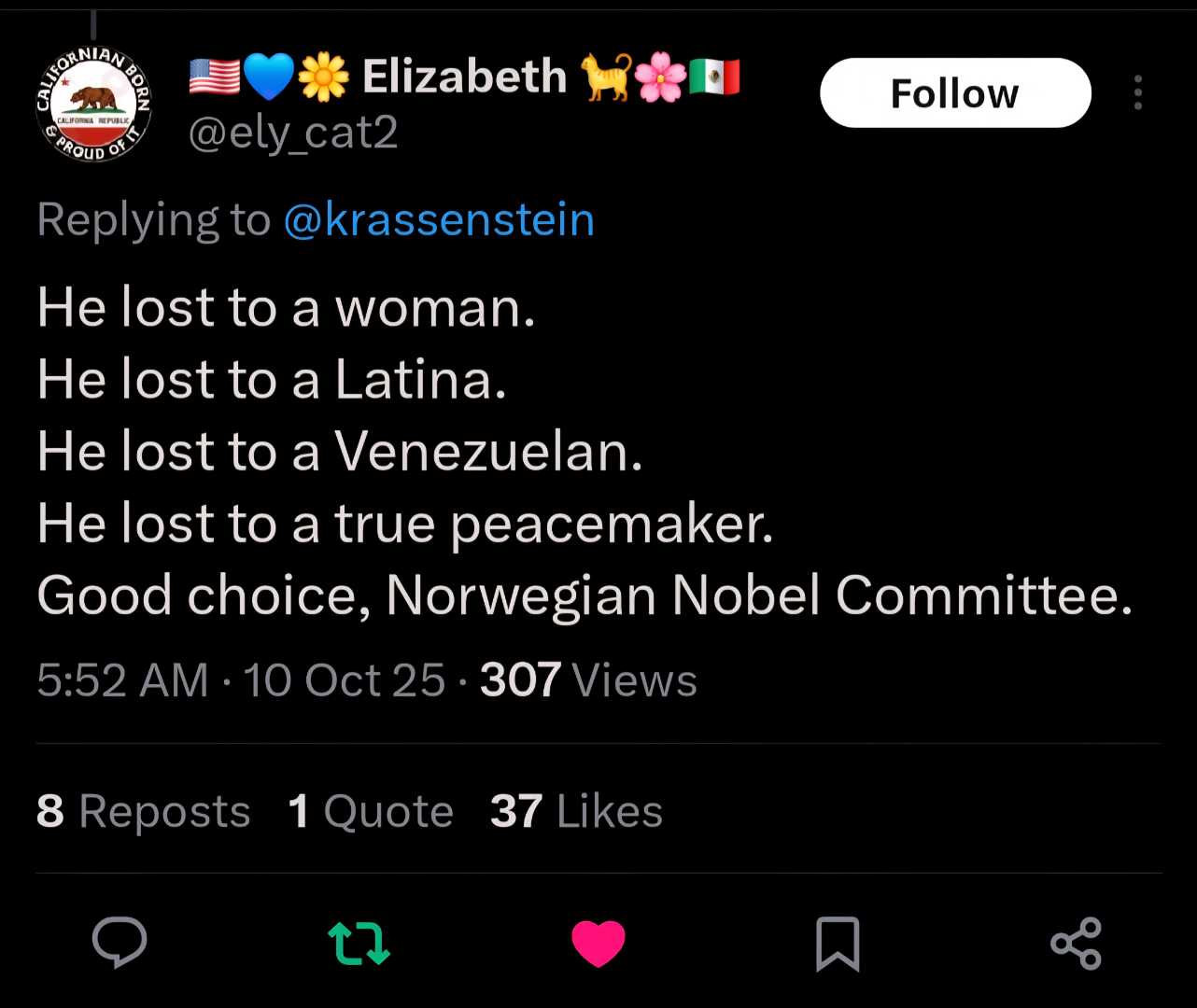 WOW! Imagine, he lost to a Hispanic woman. She wants peace for her country, not division.