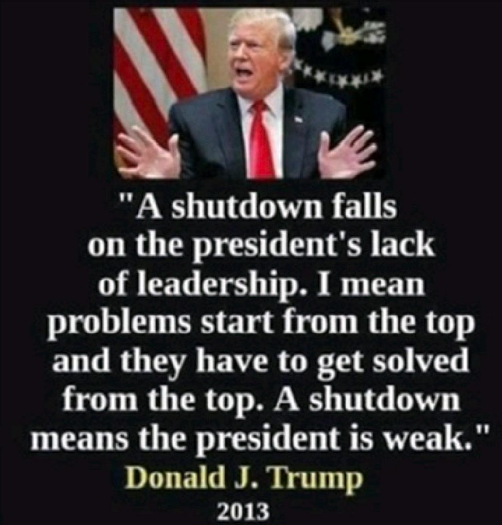 so Mr Trump the Democratic programs are being shut down because the Republicans refuse to negotiate with them it is your way,or no way our way is your highway . Republicans stop holding America hostage because we don't agree with your dictatorship ideas free the people when a president is voted in either Democratic or republican he is the president of the United States, we the people not Republican states not Democratic states they're all American states. Mr Trump you were supposed to be the president of all 51 states United States of America that's what you've done red white and blue flag stands for United