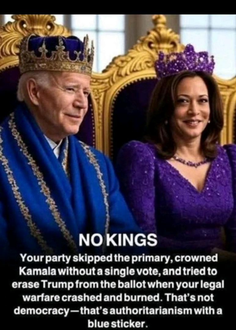 NO KINGS!! *but*…We’ll put a presidential candidate on the ballot without a single primary vote. We’ll remove your duly elected presidential candidate from the ballot. You *WILL* bake our cake. Newsom *WILL* dictate the car you drive. No gatherings of more than ten. Take this sh☠️t or be fired. Women can become men. You’ll buy insurance or pay a fine but illegals get it free. Teachers will chose your child’s gender. You *WILL* use our pronouns. You cannot visit grandma in the hospital. You cannot attend grandma’s funeral after Remdesivir killed her. Trust the *sCiEnCe*. Speak right or be banned on social media. No God or prayers in school. Men have a right to invade girls sports and locker rooms. Illegals are not illegal. Here’s an app for you to rat out your neighbor. NO KINGS unless it’s *OUR* KING!!
