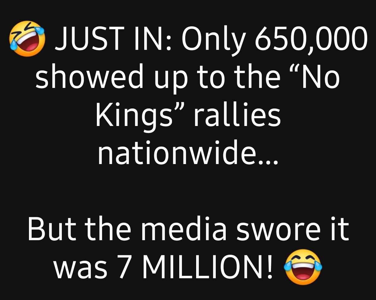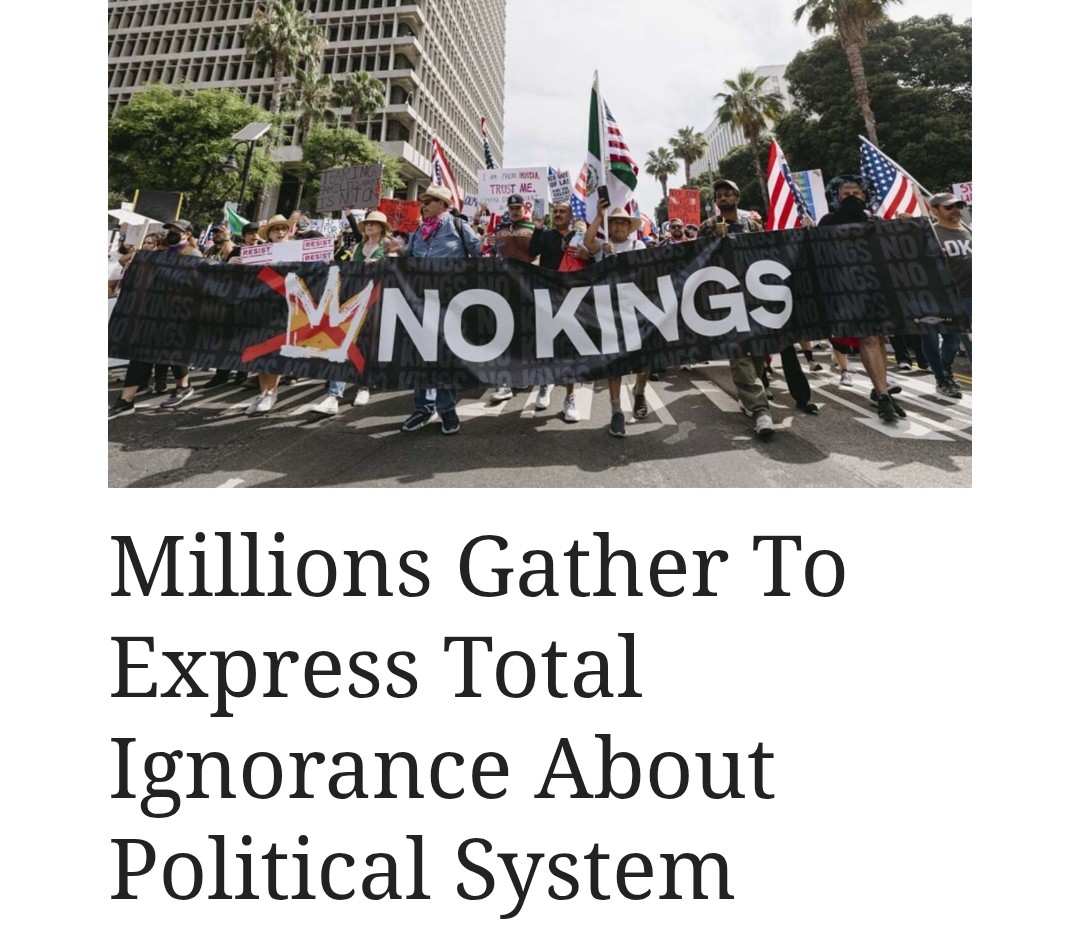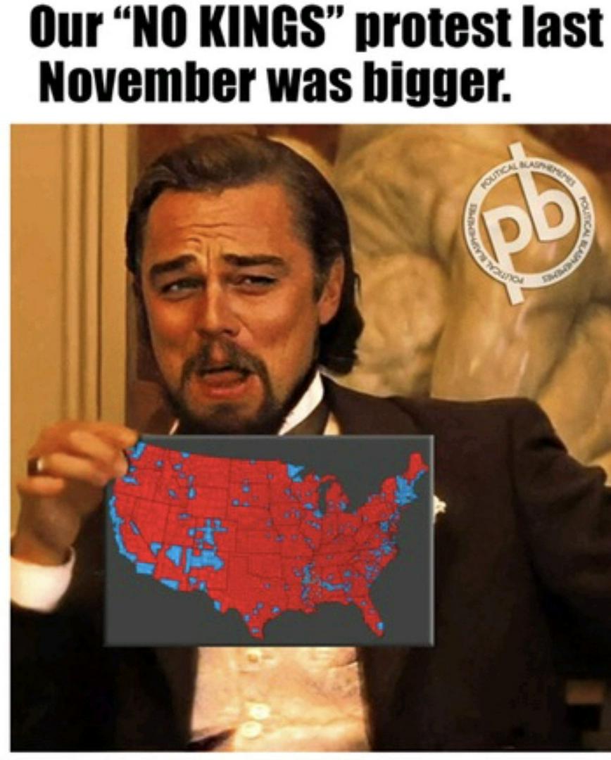 let's see, there is 338 million US citizens, and only 7 million shows up for no kings nation wide, I'd say that was not a good turn out, in fact you'd have to call it a flop, 331 million didn't agree with your nonsense, And President Trump is still 338 million citizens President,