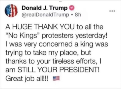 He’s no Kings rallies are about the stupidest thing I have ever seen in my life, but I guess liberals will come up with any reason to get out there and show just how stupid they are. The only thing they’re accomplishing is costing these cities more for added police protection, and traffic control. America has no kings and I don’t think we will have kings in the future.