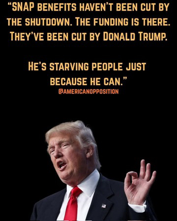 They have the funds available to continue SNAP payments during the shutdown. Repubs are CHOOSING TO STARVE THE WORKING POOR.