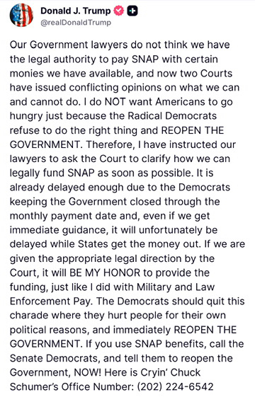 Trump has been doing everything he can to ensure that Americans are supported during the shutdown. however these crazy Democrats want children to starve. the only reason why there's even an issue with SNAP is because the Democrats shut down the government. all the Democrats have to do is pass the clean continuous resolution and all of these problems would go away. Democrats are disgusting