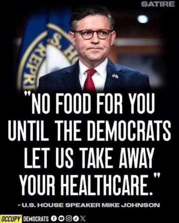 first of all you need to see the video that he made while Biden was in office stating that any of these shutdowns are completely the fault of the president. then you need to understand that Democrats will never sign a bill that limits food for the hungry and throws millions of people off health Care. that's just how it is. I know these things are of no interest to m a g a Donald but they're real and they exist in Democrats will actually do their jobs by not going along with this nonsense