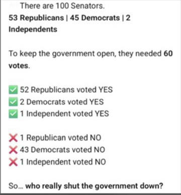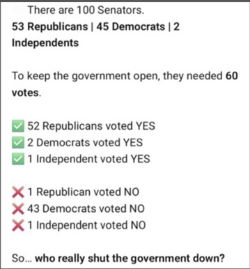 One honest question if the republicans has control of the house senate and the white house why do they need democrats to reopen the government 🤔. Second this situation is about illegals getting healthcare so I am told. How can an illegal get free healthcare we all know they can pay taxes but since they are illegal can’t and will never get any help. This can’t be the hill we dying on right