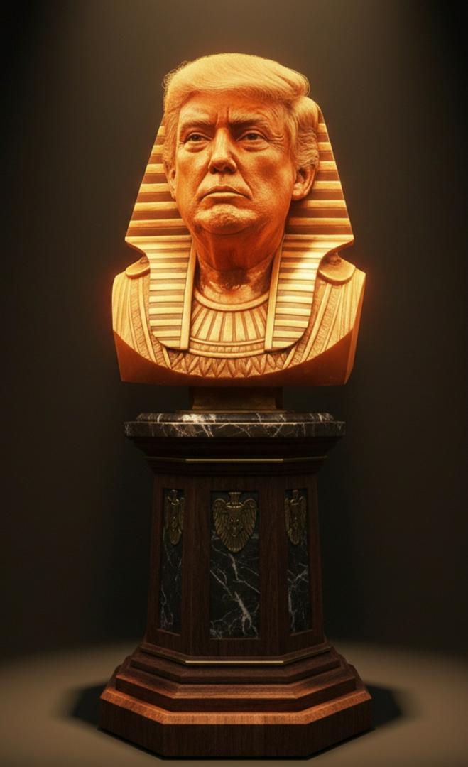 This orange fake Pharaoh Donald Trump having his name added to the Kennedy Center interior shows he is one diluted bully. When he expires, everyone that follows him and his fans should be buried in a football-sized stadium mausoleum to go to the afterlife with their master for sympathy.