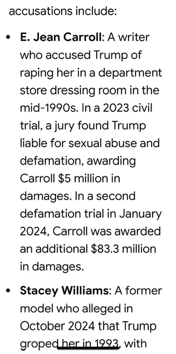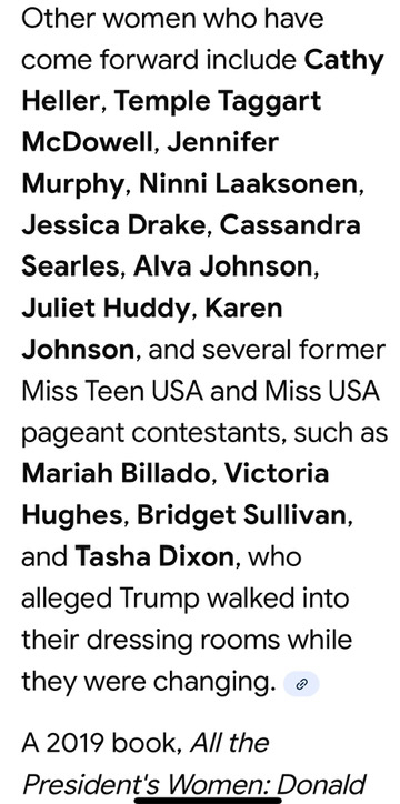 Trump your lying again that every woman lied about your involvement with them. You’ve already been found guilty in a court of law and you’re a felon. You would take the stand to defend yourself which means you know you were guilty. You will eventually have to go to prison after your time in office. I’m sure there were others but they refused to come forward. Then we have the Epstein file scandal which will show how involved you were. Trump all these felonies and cases pending will eventually catch up with you.