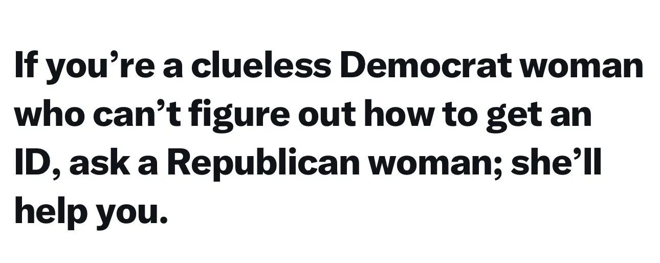 Amen. Women have IDs if they buy liquor, even I at 74 have to show my ID, get on a plane, open a checking account, all the things he said. The idea women, now the only group you can apparently call inept and too stupid to get an ID, can't manage getting an ID is ludicrous.