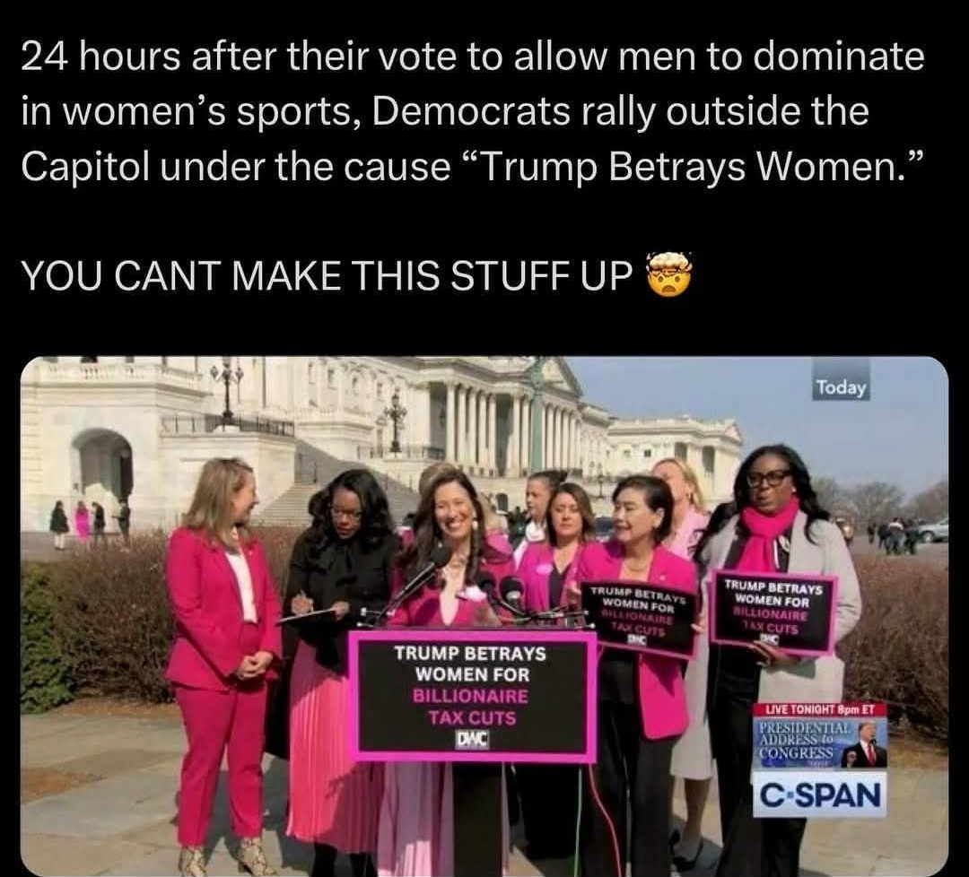 Not surprising from the party that doesn’t know what a woman is. But I wonder why feminist are so quiet? They used to be for women’s rights and now they promote women being canceled by men and having no rights. No right privacy, no right to fair competition, how they’ve even gone so far is to promote men can do anything better than a woman, including being one.