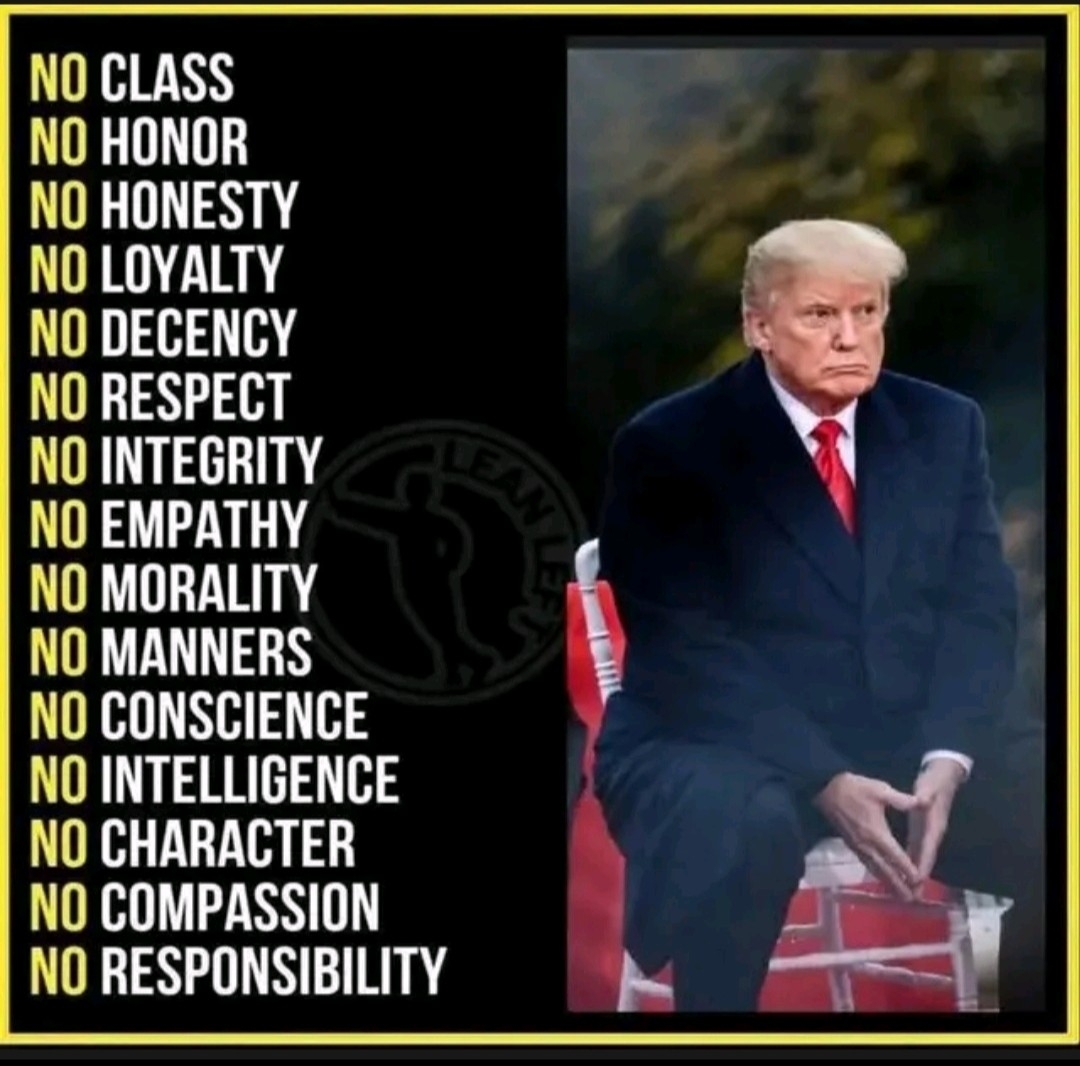 No couth, no decorum, no class,no morals ,no integrity, no honor no grace, no sense of responsibility for the office. WTF is this guy doing in the WH and representing this country?