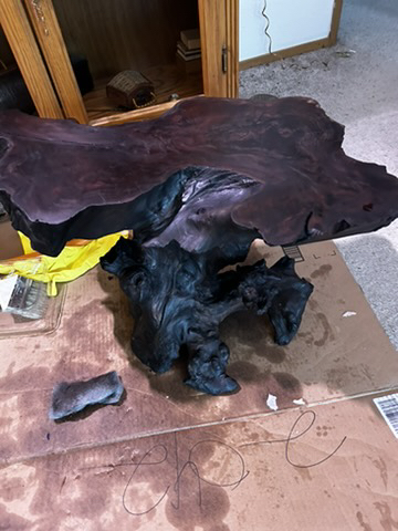 found this in an antique store. it was a burned stump & table top. i used a fine steel scrubber & then some tongue oil & absolutely love it!!!