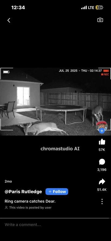 Thanks for telling us that this was a chromastudio AI creation. I didn't pay attention to that caption at all until I had watched the deer jumping off the trampoline SEVERAL times to try to tell if the dear had been INJURED!!!! After deciding that the dear was Ok, only then did it occur to me to pay attention to the caption below the video! I even read the caption when I first arrived, but I ignored what it said because I was more worried about the deer's health.