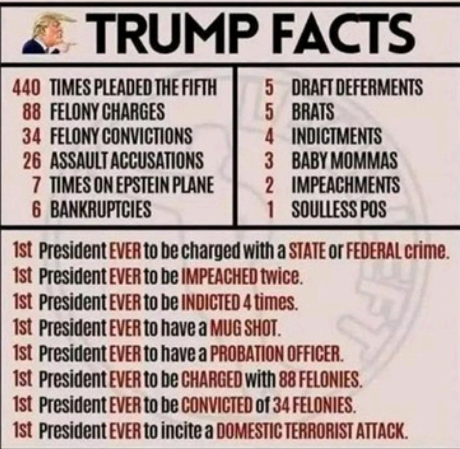 Failed business man, convicted felon, sexual predator, pathological liar, unapologetic fascist, backed by every racist organization in the world, republican. Vote blue midterms