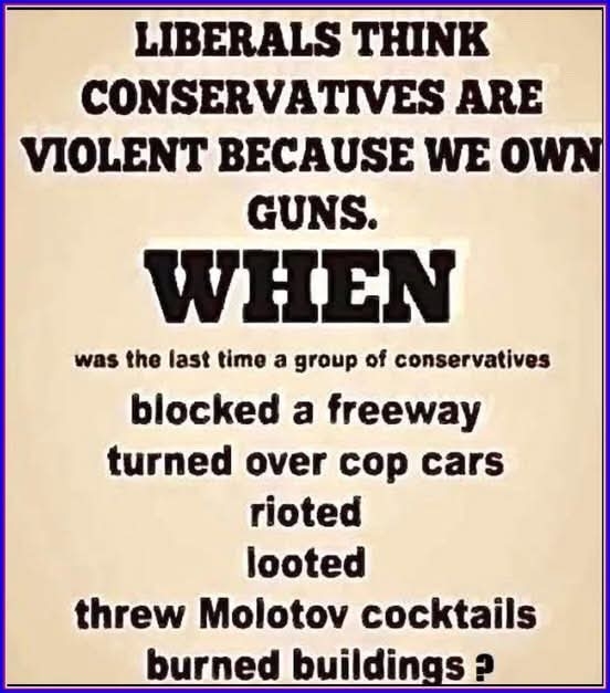 Kirk killed, prayers. Floyd killed, looting and burning. No conservative says they’re happy to see a liberal killed. Libs are happy to see Kirk die. Libs call people Nazi’s while not even knowing what a Nazi is. Libs openly cal for violence, conservatives do not. But, sure. It’s the conservatives who are the violent ones. 🙄