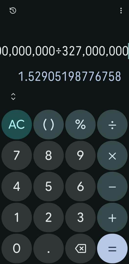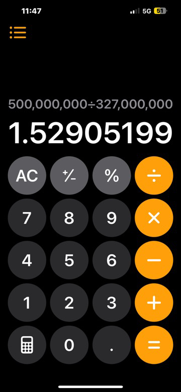 500m DIVIDED by the population of 327m which ends up at 1.52 mil per person.