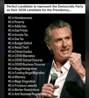Greasy Gavin ACCOMPLISHMENTS as Governor of California: # 1 in residents exiting the state #1 in businesses exiting the state #1 state w/ the highest debt #1 state in poverty #1 state in highest state taxes # 1 state in highest gas tax #1 state in homelessness #1 state in drug overdoses #1 state in suicide #1 state in Federal Welfare