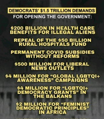 13 times the Democratic voted down at temporary Bill to open the government through the end of November which would give everybody their benefits the Democrats didn't vote one of them. 0 for 13 and you tell me who's fault it is