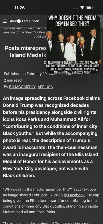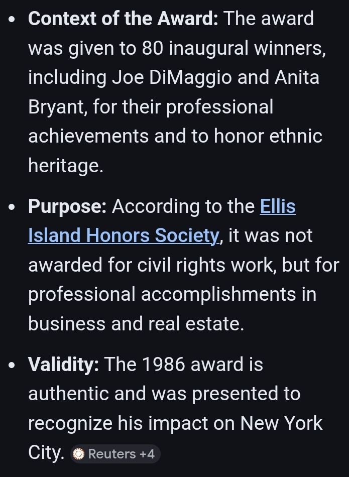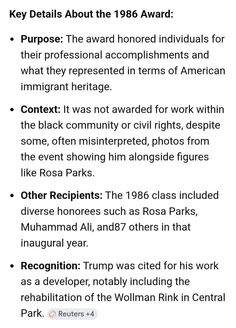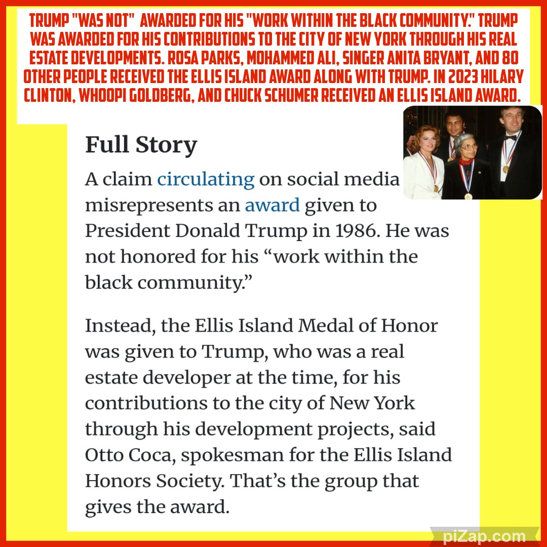 FAKE NEWS! 😹 Just because a person takes photos at events with prominent black folks doesn't mean they're not a racist. I'm 61 years old and I remember this Ellis Island award and Trump "DID NOT" receive his Ellis Island award for helping inner-city black children. The Ellis Island award is given to people for their contributions in different areas. Hillary Clinton, Whoopi Goldberg, Chuck Schumer, and many more have received the Ellis Island award. The truth 👇🏼.
