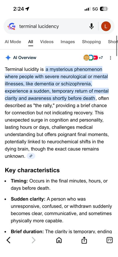 Terminal lucidity is a rare, unexpected phenomenon in which a person who has been mentally impaired—often for years—briefly regains clear thinking, memory, speech, or personality shortly before death. What it looks like A person with advanced dementia, Alzheimer’s, schizophrenia, brain injury, or stroke may suddenly: Speak coherently Recognize loved ones Recall memories Express emotions clearly The clarity can last minutes, hours, or (rarely) a day or two It is usually followed by death soon after (often within hours or days) Why it’s puzzling Terminal lucidity is surprising because: The brain damage is considered irreversible The cognitive improvement happens without treatment It contradicts what we expect from neurodegeneration