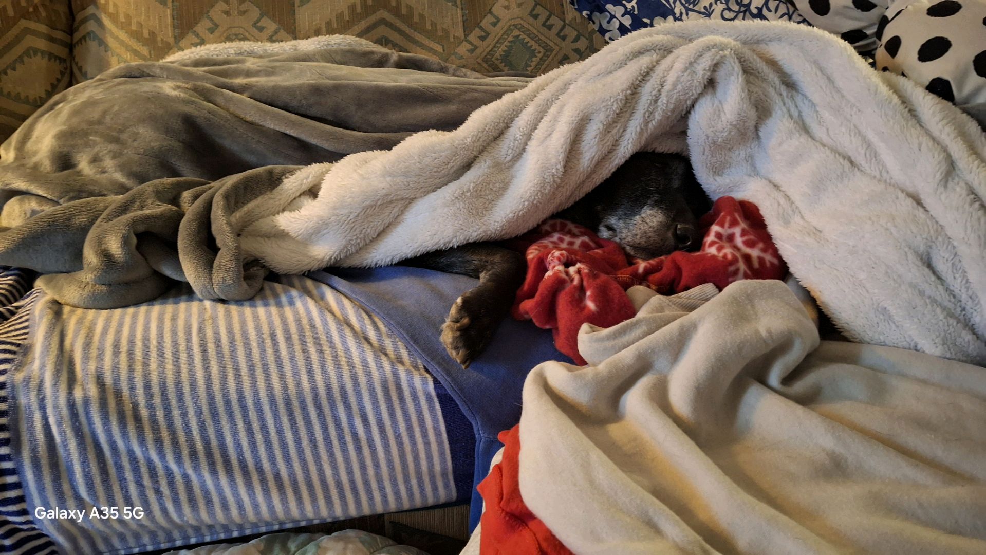 My 14 yr old black lab under the electric blanket. She refuses to come out! 😘