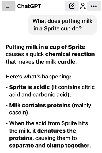 had to look it up 😆 Putting milk in Sprite is a way to make a sweet, creamy drink called Milkis or doodh soda, which is popular in some parts of Asia. The milk adds creaminess and a unique flavor to the lemon-lime soda, combining the fizziness of Sprite with a milky, yogurt-like taste.