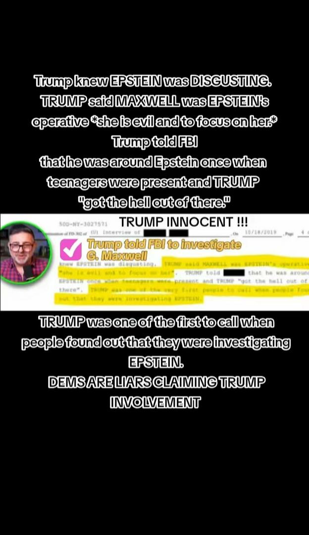 Trump informed FBI of Maxwell as "evil" & Epstein!!! He said when teens were around he got the hell out of there!! And Trump never went to the Island. If Trump had been with teens Biden, Obama and Hillary or Bill would have BROADCASTED IT EVERY SINGLE TIME they had the chance!!