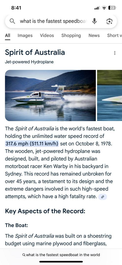 Looks to be just idling if this were Ken Warby’s boat. Doesn’t look to be going anywhere near 300mph /500km but if you say it’s the fastest boat then what you may have ment to do was finish that statement with, This is the Fastest Boat “on the water, you seen that day.” For the record. Your “honesty” is not in question here. Just thought that pointing out the obvious embarrassment of your caption here is pitiful. Considering you thought that stating “in” the planet made perfect sense and that it was necessary to correct auto correct. Be careful out there. Typing and laying down could lead to a potential slip on adhesive and landing the wrong way on the sky.
