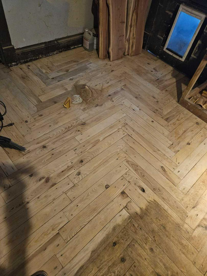 Herringbone pattern, I'm doing this in my kitchen from old pallets turned out amazing, take the sawdust from sanding add loctite waterproof glue to it smear across sand again, all your gaps are filled. And then polish