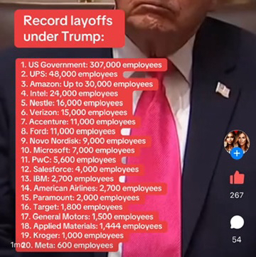 Unemployment is higher than ever. Why? Because he created it by firing thousands. Our economy was way better with Biden than it is now. Gas or eggs are not lower where I live. Even if Trump went to a grocery store he would have no clue about prices because he doesn’t shop! The man can lie sooo good and unfortunately there are people who believe him at his word. That’s all they are, words. Nothing to back them up. The country is richer than ever, ON OUR DIME.