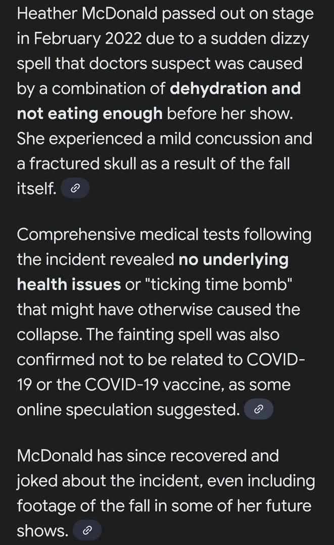 She did NOT pass out. She faked it for attention and to “prove” her point. If she had truly passed out/fainted she would have dropped that microphone before she ever hit the floor, not held onto it for dear life. Her hand would have relaxed NOT held tighter. She had a skull fracture from being an idiot, she hit harder than intended. Play stupid games, win stupid prizes. I used to have a psych patient that faked seizures and passing out on a weekly basis. He never fractured his skull but he always held tight to whatever he was holding.