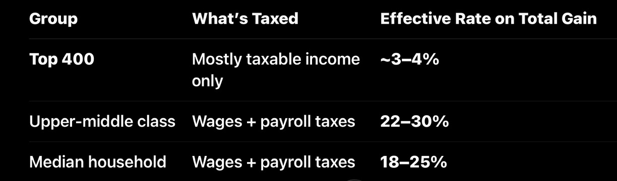 People talk about billionaires’ effective tax rate being similar to middle and upper middle class Americans. However, if you add in their total growth each year, it is VERY different: