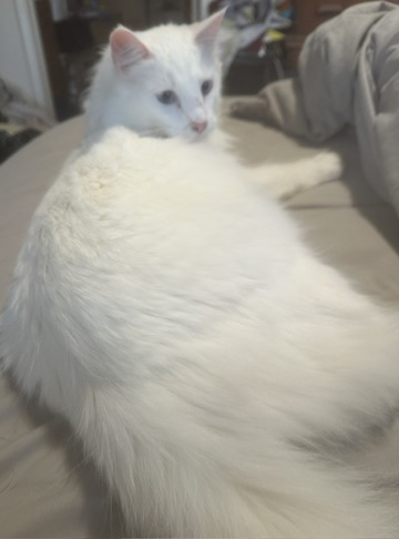 Your cat is so big and beautiful. I had a big white one like this one. I loved her dearly,. But unfortunately, one day when she was outdoors a stray rabied dog attacked her and we couldn’t save her in time . We loved her so much and she was the most loving cat ❤️❤️