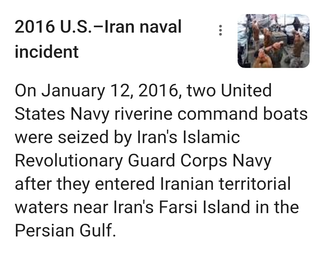 Not true, we entered after this incident and bombed their Nuclear facilities. Remember, this Navy Ship was captured by Iran under the weak Biden administration. This wouldn't have happened under President Trump.