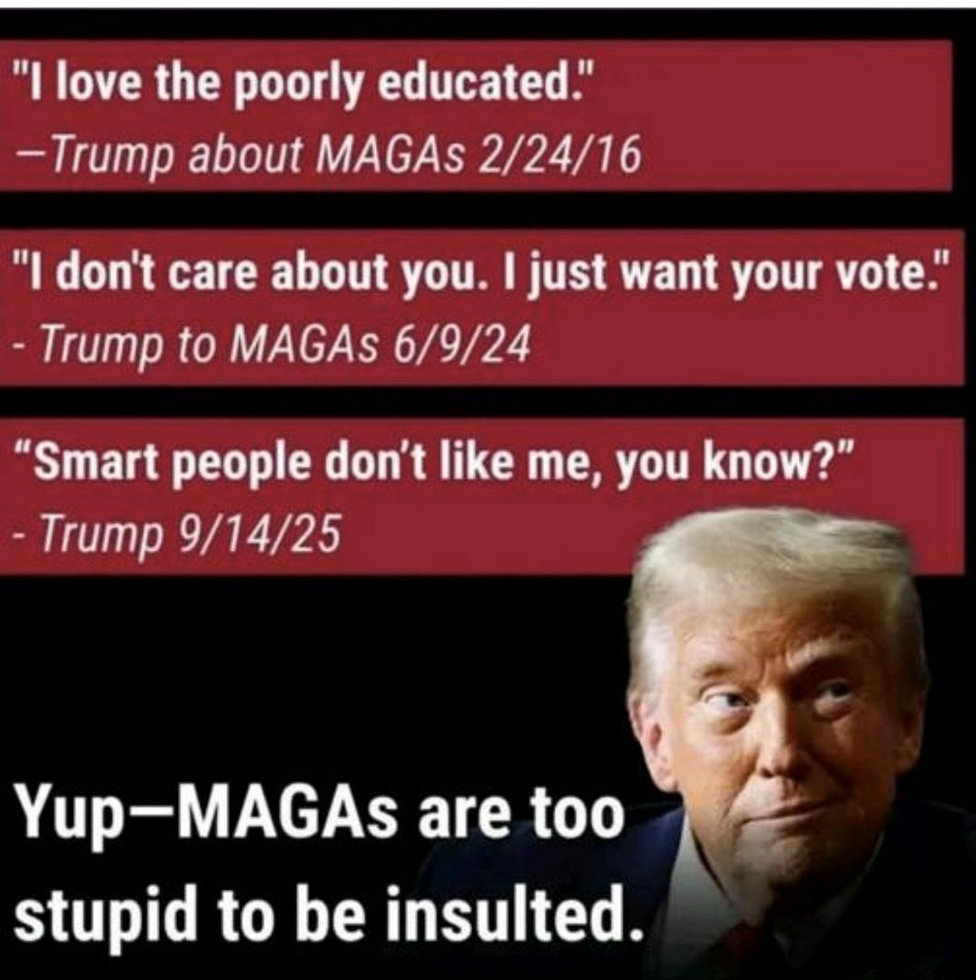 It's funny how the right doesn't realize how completely moronic , they are. The things they post don't make sense.They let Donald Trump and Elon Musk manipulate them.They vote against their own best interests.This is why trump loves the poorly educated , so easy to manipulate.