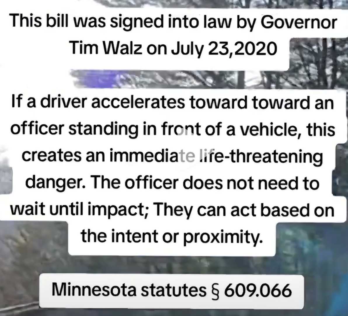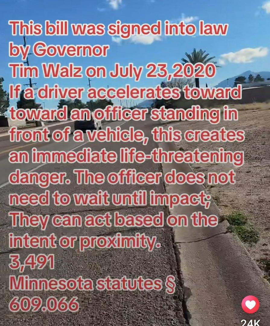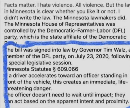 I suggest you read Minnesota law 609.066. The Federal Law Enforcement Officer followed both Federal and State Law! Federal Law follows. 18 U.S.C. § 111 makes it a federal felony to forcibly assault, resist, oppose, impede, intimidate, or interfere with federal officers (like FBI, DEA, U.S. Marshals) during their duties, with penalties varying by severity, from simple assault (up to 1 year) to using a deadly weapon or causing bodily injury (up to 20 years), requiring proof of force, which can be a threat showing apparent ability to harm.